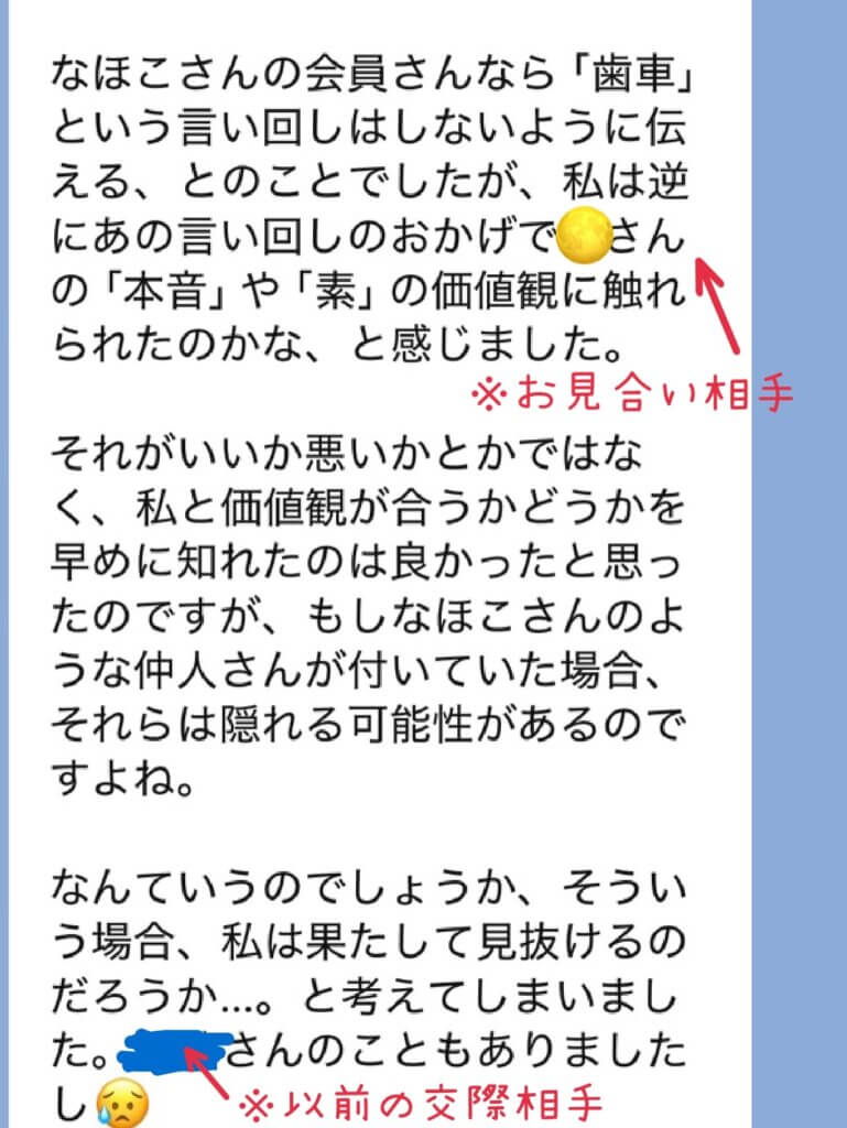 そのことについて、お見合い後のフィードバッグで、彼女とお話しした時に、「もし男性がうちの会員さまだったら、歯車