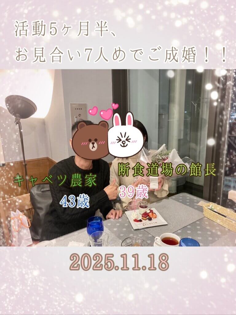 活動5ヶ月半、お見合い7人めでご成婚です。 そして今月、なんと4組めのご成婚!!! あたふたしている中西です。 39歳。 まだ若いのに断食道場の館長を任され、日々奮闘されている彼女が、共通の知り合いから紹介でご入会されてきたのは今年6月。 3ヶ月マ...