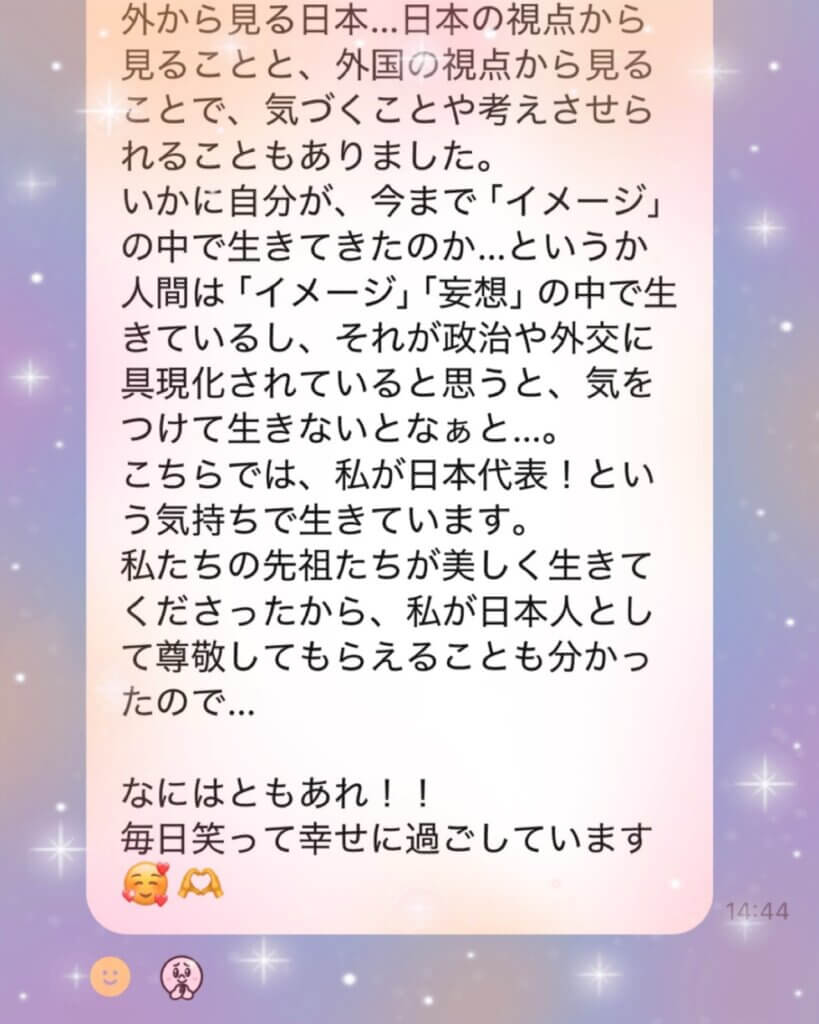 私たちの先祖たちが美しく生きてくださったから、私が日本人として尊敬してもらえることも分かったので…