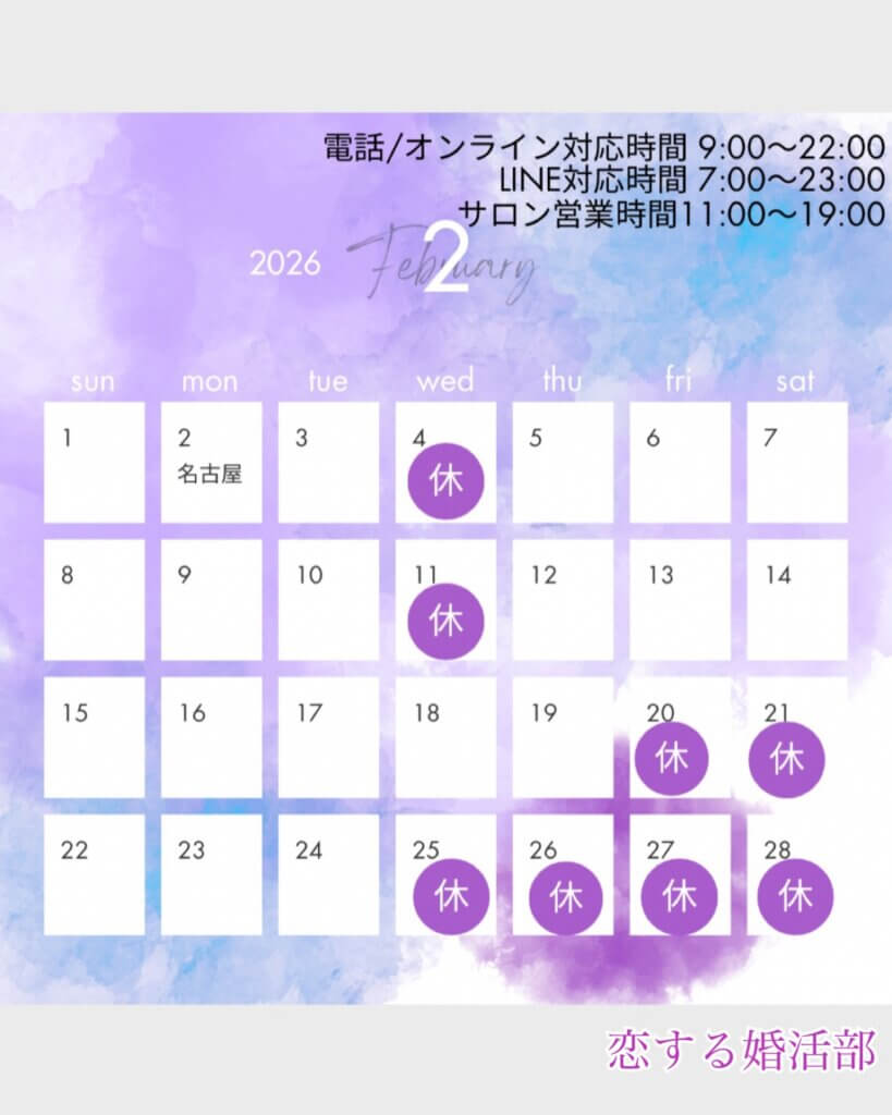 恋する婚活部2月の営業カレンダーとなります。 2/25〜3/5まで、7年ぶりのバリ島です。現地でもオンラインやLINEはできると思うのですがネット環境がもしかしたら・・・の場合があるのでとりあえずお休みとさせていただきました。(LINE対応はできると思い...